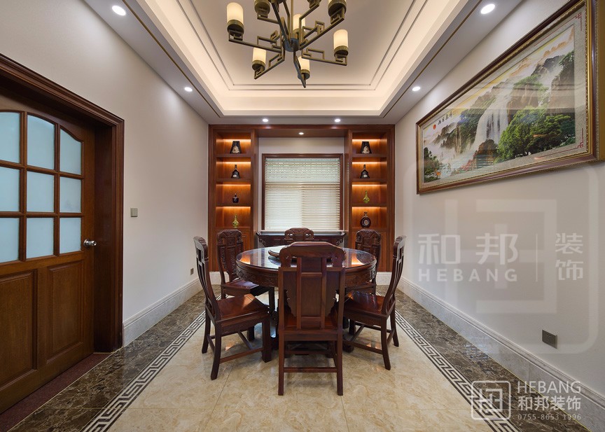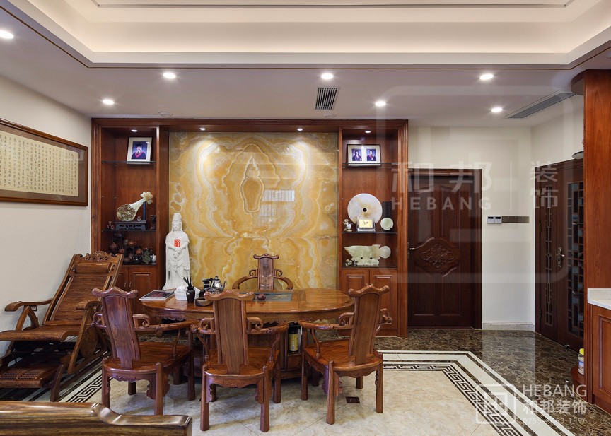 空間內大量運用的木飾面、藤條、石材等天然裝飾材料,以及配合使用的棉麻質地等極具自然情趣的家具在設計師的巧妙運用下打造出了一個靜謐雅致,深富中式的家居空間。