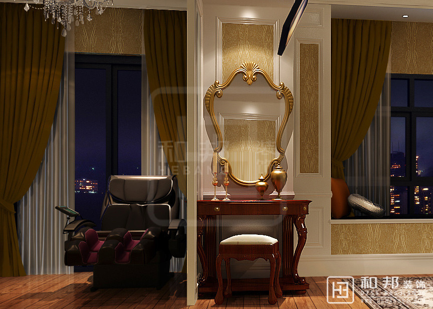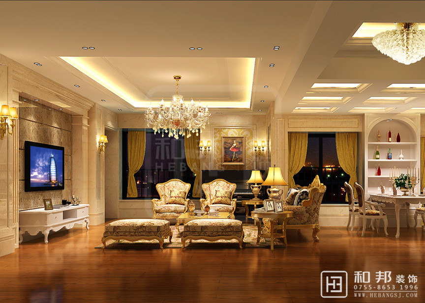 本設計為典型的美式風格,豪華大氣,尊貴典雅,簡潔的設計,空曠的視野,讓人樂在其中。整個空間氣息以歐式的高貴優雅氛圍為主題,用現代的設計手法表現。