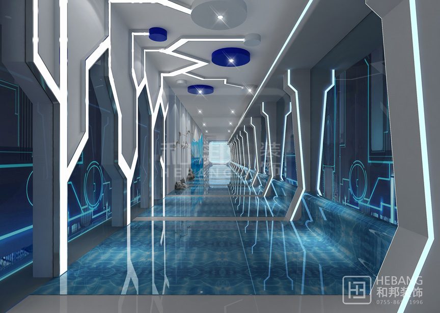 藍色貫穿于整個設計前后,讓人感覺干凈整潔。墻壁飾有的古代名言警句以及極富現代科技感的線條,行走在其中,像是穿越了古今,讓人流連往返。