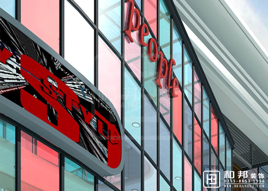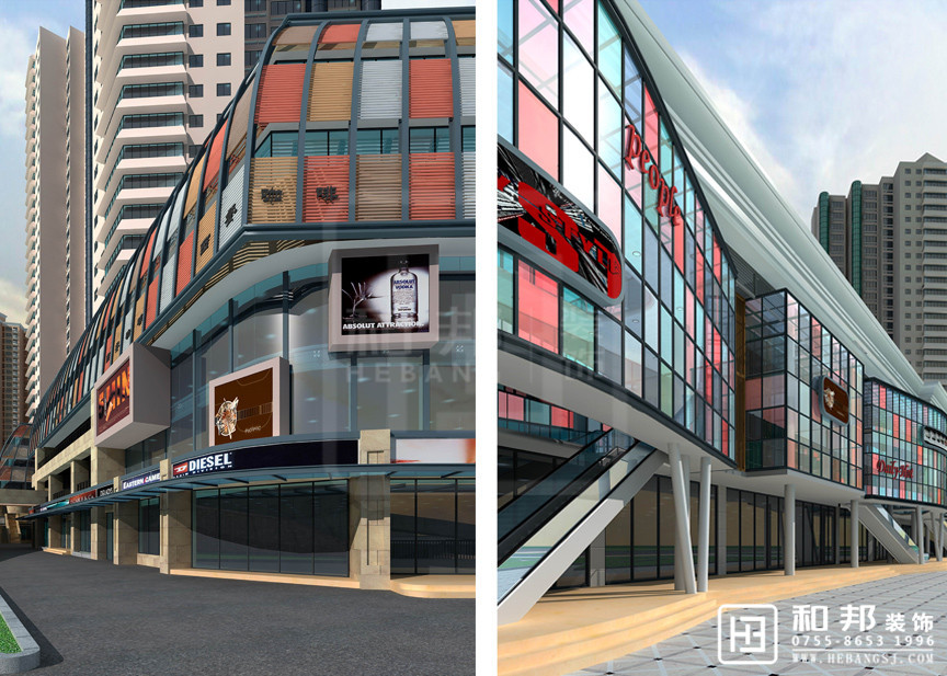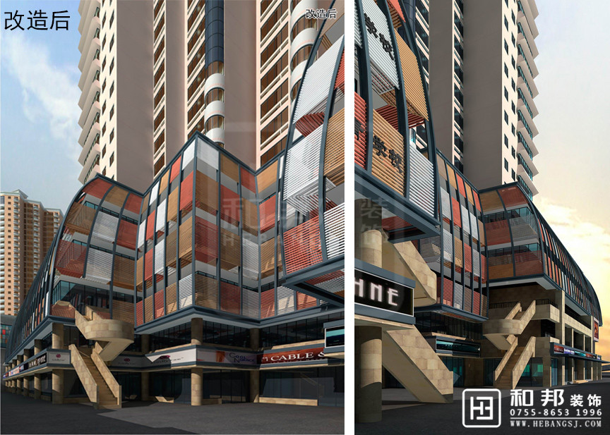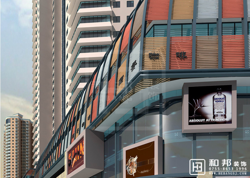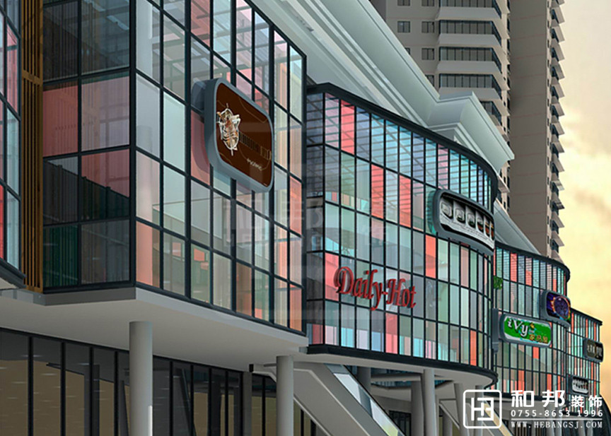 本設計樓下商業(yè)區(qū)外觀使用了幾種顏色的拼接了起來,給整個空間添加了色彩感。