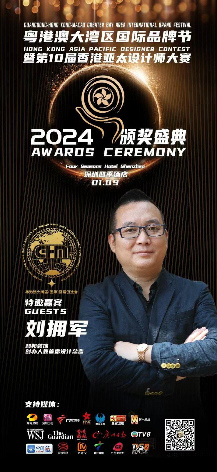 2025 年 1 月 19 日,2024 粵港澳大灣區(qū)國際品牌節(jié)暨第十屆香港亞太設(shè)計頒獎盛典在深圳福田區(qū)福華三路 138 號深圳四季酒店隆重舉辦。和邦設(shè)計創(chuàng)始人劉擁軍作為特邀嘉賓出席此次盛會,彰顯了其在設(shè)計領(lǐng)域的專業(yè)影響力。